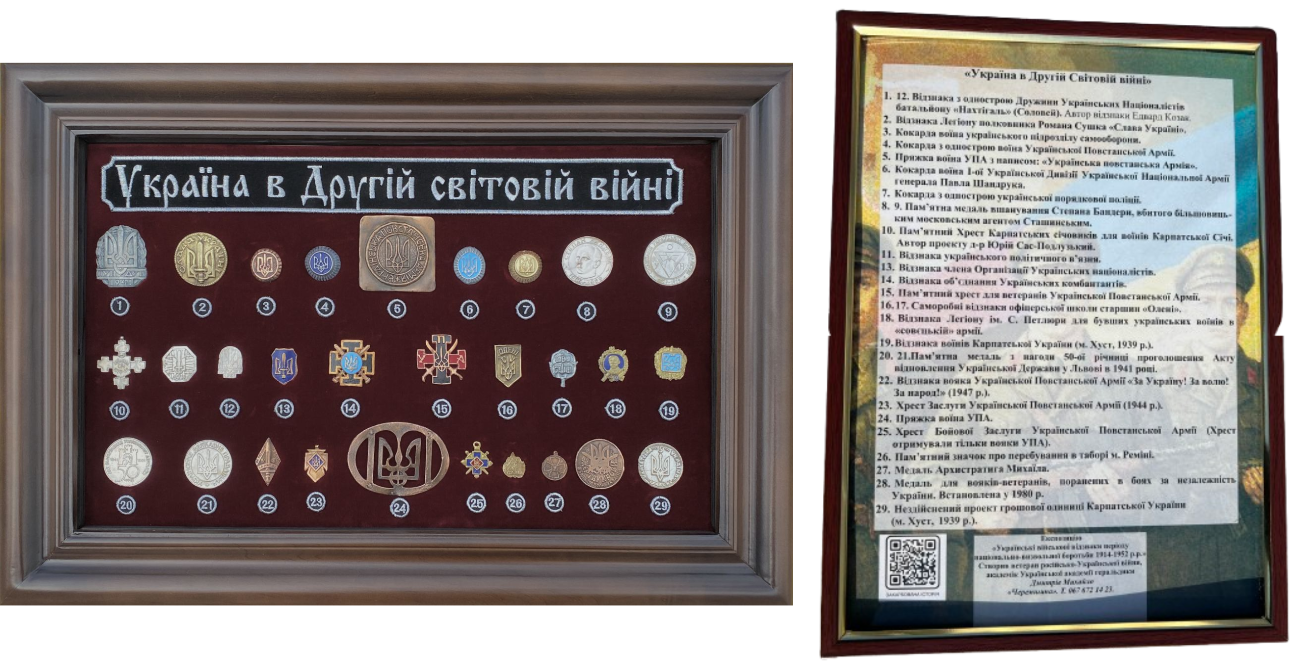 У цій частині колекції представлено 29 унікальних відзнак, присвячених участі України у ІІ Світовій війні, зокрема пряжка воїна УПА з написом "Українська повстанська армія" (№ 5), кокарда з однострою української порядкової міліції (№ 7), відзнака українського політичного в`язня (№ 11), медаль Архистратига Михаїла (№ 27).