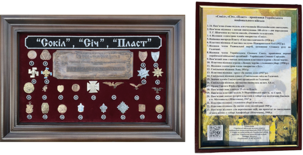У цій частині представлено відзнаки українських товариств "Сокіл", "Січ" та "Пласт". Усього налічується 24 відзнаки. Молодіжні товариства "Сокіл", "Січ" та "Пласт" вважаються провісниками виникнення українських військово-політичних організацій.