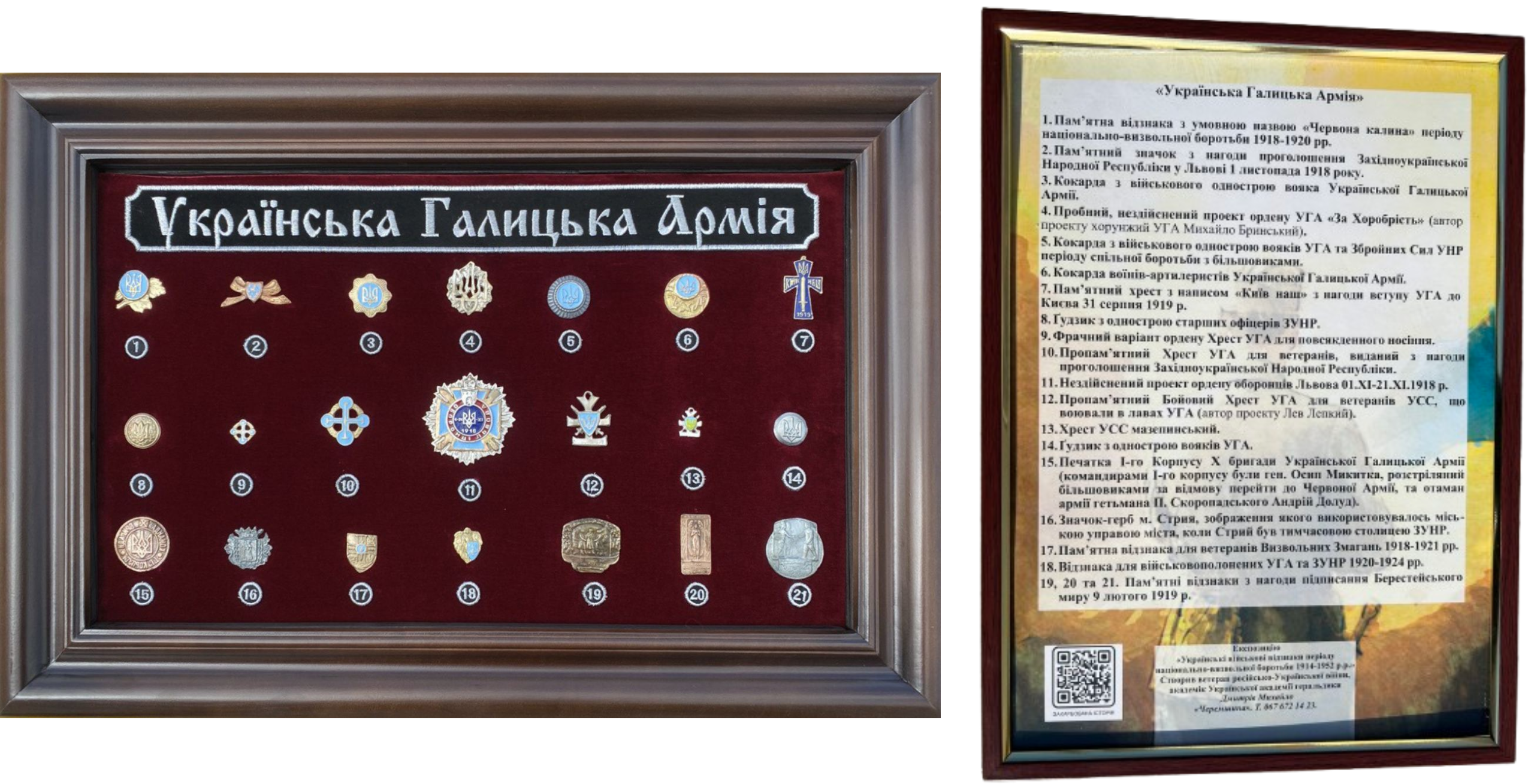 Ця частина колекції складається з 21-єї відзнаки, що відносяться до періоду діяльності Української Галицької Армії. Це, зокрема, такі унікальні фалеристичні пам'ятки, як кокарда з військового однострою вояка УГА (№ 3), нездійснений проект ордену оборонців Львова (№ 11) та багато інших.