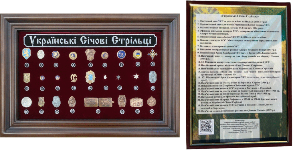 Друга частина експозиції складається з 26-ти відзнак, що відносяться до періоду діяльності Українських Січових Стрільців. До Вашої уваги пам'ятний знак з нагоди 80-ліття УСС (№ 14), відзнака з однострою старшин УСС (№ 7), різновиди кокард для студентів-однорічників в складі УСС (№ 11 та 12) та інші.